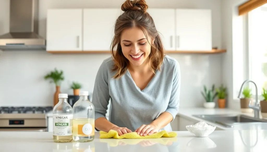 Use a mixture of equal parts vinegar and water for quick countertop cleaning. Spray the solution on surfaces, then wipe with a microfiber cloth for a streak-free shine. Apply this approach daily to prevent the buildup of dirt and grime. For tougher stains, sprinkle baking soda on the affected area, then scrub with a damp sponge. Rinsing with water removes any residue, leaving countertops spotless. Utilize this method regularly to keep kitchens looking fresh and inviting.